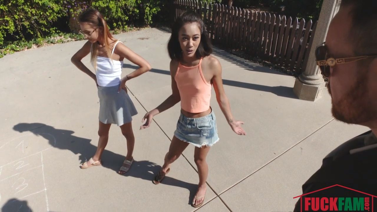 Девушки играли в классики перед домом. Мимо проходил сосед. Ему не понравилось, что девчонки расчертили асфальт перед его домом. Он сказал им, что они занимаются какой-то хуетой. Сосед зашел в дом, а девчонки озадачились. Одна из них проболталась, что её мама иногда заходит к этому соседу. Оказалось, что и мать её подруги любит навестить этого мужика. Девочки решили последить за ним, чтобы узнать, чем он их привлекает. Они перелезли через забор и увидели в окно своего соседа. Мужчина был совершенно голый. Девушки так нагло смотрели на его член, что забыли об осторожности. Мужик спалил их и завел в дом. Он спросил у девушек, почему они следят за ним. Школьницы сказали что занимаются сексуальным самообразованием и хотели бы больше узнать о сексе. Сосед согласился дать им урок полового воспитания. Он приказал школьницам сесть под своим членом. Через мгновение одна школьница уже сосала член, а у второй во рту были яйца мужика. Сосед расположил девушек на диване и стал ебать по очереди. Пока одна принимала член внутрь, вторая мастурбировала. Затем он поставил девушку в очках раком и засадил ей. Он так интересно поставил малышку, что она оказалась на весу. Затем он поставил девчонок башней, так, чтобы пёзды были рядом. Он вставлял член в одну дырку, а с другой работал рукой. Мужик кончил прямо на эти пёзды, пока юные сучки теребили свои клиторы.